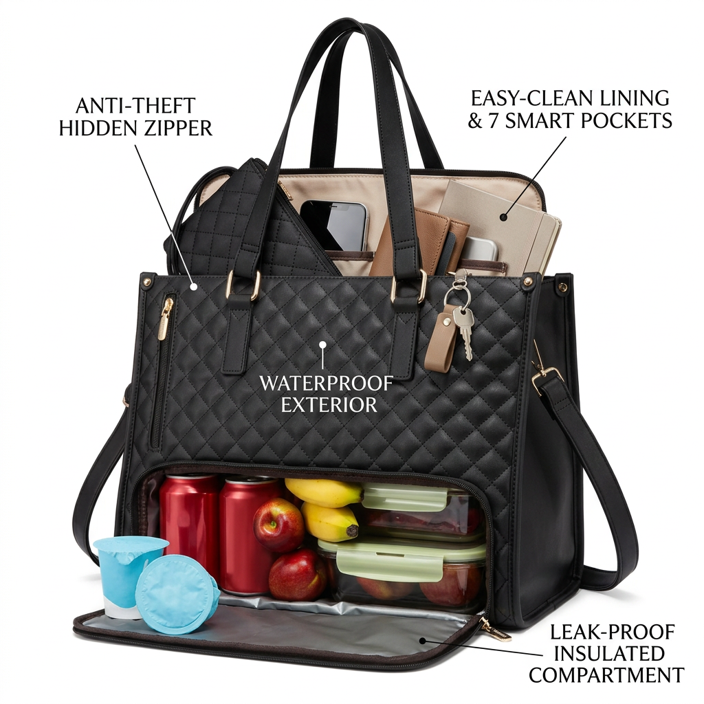 Most totes are just open pouches. The 3-IN-1 has a dedicated leak-proof food zone, anti-theft zipper pocket, and 7 organized interior pockets — it's a system, not just a bag.